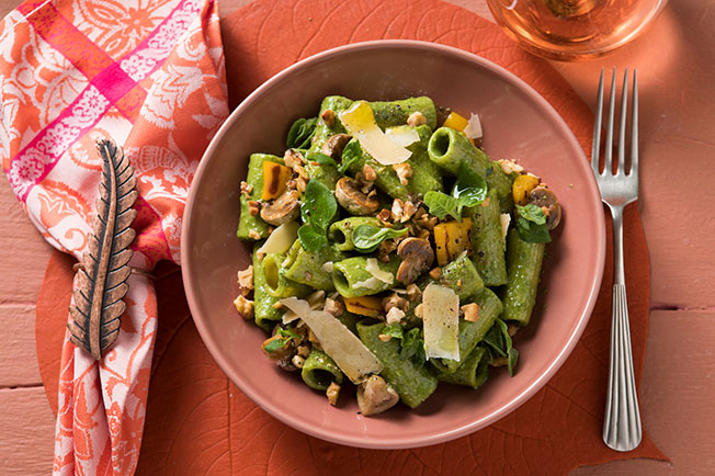 7. Adicione o molho pesto ao macarrão e misture delicadamente – vá acrescentando aos poucos a água do cozimento reservada, de colher em colher, para deixar o molho mais fluido. Divida em 4 pratos e sirva com os cogumelos e pimentões dourados, as nozes picadas e lascas de parmesão.